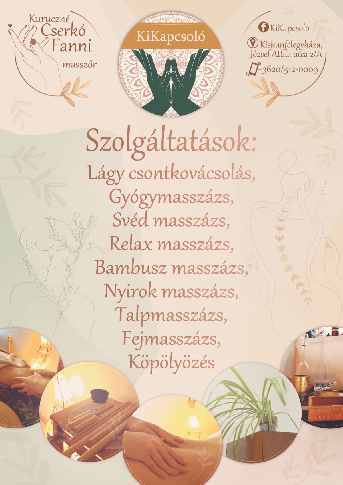 Több mint 3 éve segítek masszázzsal a hozzám fordulóknak. Feszültségoldás, izomlazítás, testi-lelki kikapcsolódás. Fő szolgáltatások: Masszázs (húzódások, becsípődések oldása, rossz testtartás feszültségének lazítása), ajánlott sportolóknak, diétát/edzést kezdőknek, ajándékutalvány kapható. Nyitvatartás: időpont egyeztetés alapján. Kuruczné Cserkó Fanni